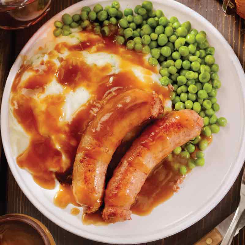 Bangers & Mash: Pair with our gourmet pork sausages, caramelized onion gravy, and a side of peas for a pub-style classic.